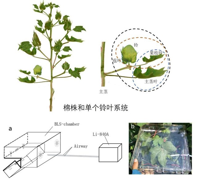 图1 棉花铃叶系统光合作用及测定系统示意图(a)和实物图(b)