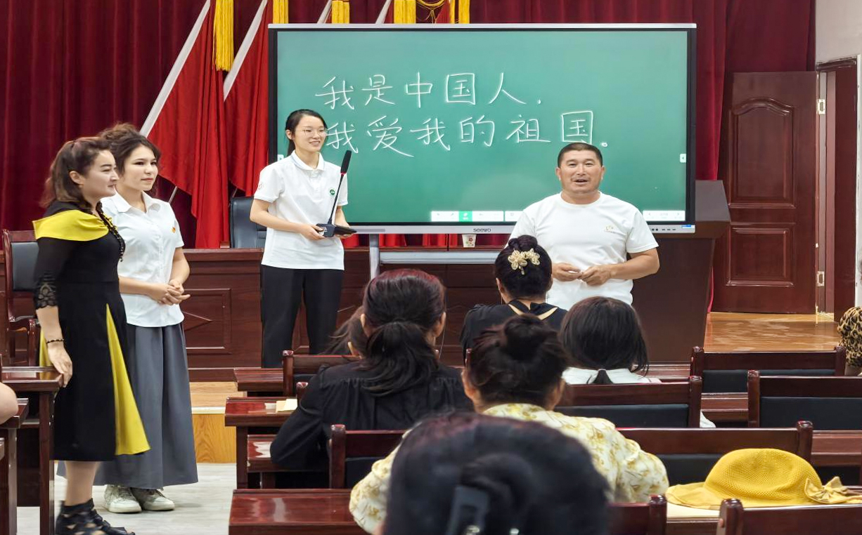 立足实际、注重实效。团队成员从生产生活息息相关的汉字为起点,采取读、听、写、演相结合的方式,开展“一对一”结对帮学,把艺术表演融入国语培训之中,让培训变得更加通俗易懂,增强培训的趣味性和实用性,提升各族群众学用国家通用语言的积极性。在活动中,连队职工共同朗诵课文和诗歌,共赏同一本书籍,同唱一首爱国歌曲。在 “同讲普通话 共筑中国梦”晚会中,团队成员通过诗歌朗诵、情景剧表演、歌曲传唱、乐器表演等多种形式,生动地呈现了《我爱我的祖国》和《我有一个幸福的家》等主题内容,展现了深厚的爱国情怀与家庭温情。