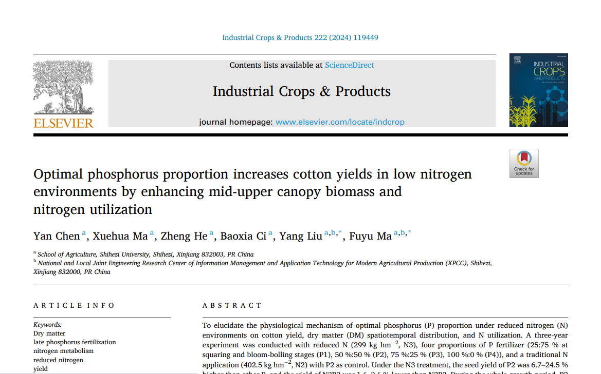 近日,石河子大学农学院水资源高效利用与农业信息技术课题组马富裕教授团队在作物水肥一体化精准施肥研究中取得新进展,研究结果以“Optimal phosphorus proportion increases cotton yields in low nitrogen environments by enhancing mid-upper canopy biomass and nitrogen utilization”(低氮环境下优化磷肥比例可通过提高中上部冠层生物量和氮素利用率提高产量)发表于农林科学领域TOP期刊《Industrial Crops and Products》(中国科学院一区,IF:5.6)。
