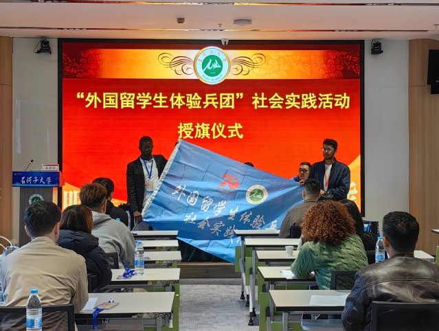 上届留学生社会实践代表为“外国留学生体验兵团”社会实践团队代表授旗。