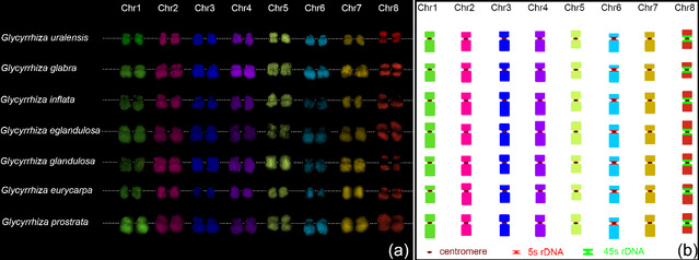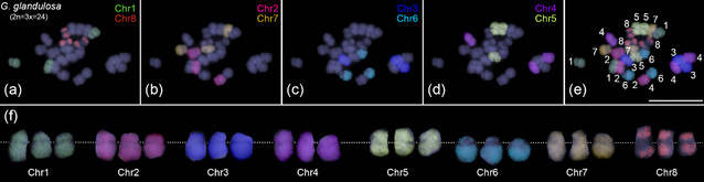 甘草是世界上最常用的中草药之一,因其能“解百毒、调百药”故有“国老”、“十方九草”的称号。我国有关甘草的记载最早可追溯到公元前200年,甘草具有抗炎、抗病毒、抗菌、抗肿瘤等众多药用价值,因其本身带有甜味,在工业领域也具有广泛应用。甘草属遗传多样性丰富、组成十分复杂,关于甘草属种间染色体的特征、进化差异及物种形成仍缺乏了解。染色体核型是物种染色体组成和进化研究的重要工具之一,比较核型分析依赖于单个染色体鉴定,但由于甘草染色体小,相似度高,使得传统细胞学方法难以区分单条染色体,严重阻碍了甘草属种间染色体进化关系和物种起源演化研究。