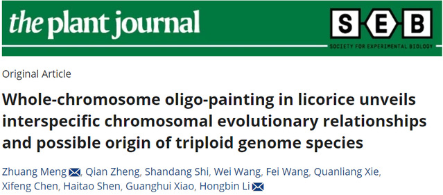 近日,我校生命科学学院李鸿彬/孟状研究团队在甘草染色体进化研究中取得重要进展,研究成果以“Whole chromosome oligo-painting in licorice unveil interspecific chromosomal evolutionary relationships and possible origin of triploid genome species”(全基因组涂染揭示甘草属种间染色体进化关系和三倍体物种形成与起源)为题,发表在植物学国际权威期刊《The Plant Journal》(中国科学院1区TOP期刊,五年影响因子7.1),据悉本研究是The Plant Journal建刊以来刊发的首篇中草药甘草染色体进化生物学研究领域文章,对甘草属植物起源演化和物种形成具有重要意义。