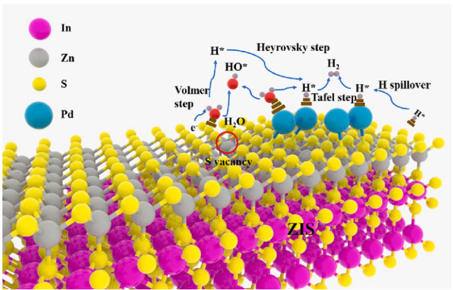 氢能被认为是替代化石能源的清洁能源。析氢反应(HER)是一种可持续的氢能源生产方式。然而,用于析氢反应的商用铂(Pt)催化剂价格昂贵且稀缺,无法完全满足未来市场的需求。钯(Pd) 丰度高于Pt,具有很强的化学稳定性。钯纳米团簇对H2的固有亲和力和选择性、快速吸附动力学和氢化物形成可逆性,具有很高的HER催化活性,可以作为理想的HER活性中心。ZnIn2S4 (ZIS)是一种典型的三元硫系化合物,具有良好的H吸附特性和良好的腐蚀性能,是一种很有前景的HER的催化剂。本研究将7.5 wt%的Pd纳米团簇(2-5 nm)高分散稳定在ZIS纳米片上,发现在低温退火过程中,Pd团簇的存在可以使得ZIS的形貌和结构保持的同时产生更多的S空位,并且有助于提高ZIS上S原子的催化能力,激活ZIS基表面的活性。
