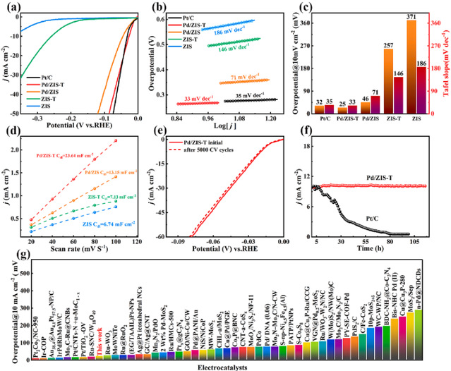 该工艺制备的Pd/ZIS展现出优异的电催化HER性能:当电流密度为10 mA cm-2时,Pd/ZIS-T样品的传递电位可达25 mV(相对于RHE),Pt/C低于32 mV, Tafel斜率仅为33 mV / dec-1,反应速率更快,在10 mA cm-2下可稳定输出100 h以上。本研究的相关结果对探索新型电解水制氢催化剂具有一定的参考意义。