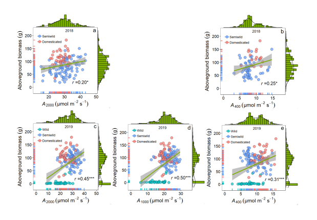 试验于2018和2019年在海南三亚国家野生棉种质资源圃进行,使用40个野生棉材料、91个半野生材料和42个栽培材料,测定高光强(2000 μmol m-2 s-1)、中光强(1000 μmol m-2 s-1)和低光强下的(400 μmol m-2 s-1)光合速率(A2000、A1000和A400)、呼吸速率、叶绿素含量、叶片形态结构和生物量。结果显示驯化第一和第二阶段生物量均显著增加(图1),同时第一阶段A2000和A1000增加,第二阶段A400增加(图2),地上部生物量与A2000和A1000、A400之间呈显著正相关关系,说明生物量增加与光合物质生产能力紧密关联(4)。此外,叶面积增大和叶绿素含量增加,可以提高光竞争能力,也是增加叶片光合和冠层碳增益的因素之一(图3)。因此,棉花驯化第一和第二阶段持续增加地上部生物量可能意味着栽培品种具有更快资源获取速率。