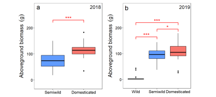 图1 比较2018年(a)和2019(b)年野生、半野生和栽培材料地上部生物量差异