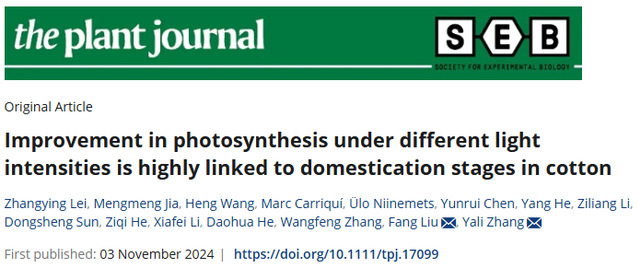 2024年11月3日,石河子大学农学院张旺锋教授团队联合西北农林科技大学农学院贺道华团队及中国农业科学院棉花研究所刘方团队在The Plant Journal期刊(中国科学院1区TOP期刊,五年影响因子7.1)在线发表了题为”Improvement of photosynthesis under different light intensities is highly linked to domestication stages in cotton”的研究论文(http://doi.org/10.1111/tpj.17099)。作者发现在驯化第一阶段(从野生到半野生)提高了高光和中光下的光合速率,第二驯化阶段(从半野生到栽培材料)改善了低光下的光合速率,从而有助于两个驯化阶段生物量的增加。因此,随着驯化不断向前推进,棉花叶片不同光强光合速率逐步提高。论文的通讯作者张亚黎教授围绕棉花驯化的光合作用研究,团队已发表系列高水平论文,应邀在国内和国际学术会议上作报告多次,研究成果得到业内专家的认可。