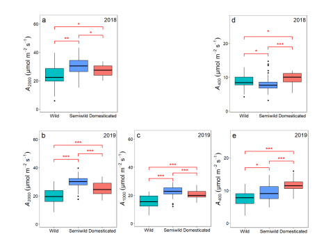 图2 比较2018年(a、d)和2019年(b、c、e)野生、半野生和栽培材料光合速率差异