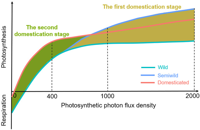 驯化第一阶段主要关注单株生产力,植物生长在相对稀疏的环境中或没有农田单一栽培环境(图5),植物通常处在高光环境中,因此驯化往往选择强光下光合速率高的特征,从而增加生物量。驯化第二阶段冠层结构改变和种植密度增加导致作物更多处在低光环境中,叶片产生弱光适应性变化,包括增加叶面积、降低比叶重和提高低光光合速率等从而获得更多地上部生物量(图1;图2)。结合前人研究可以看出,在过去的作物驯化和育种过程中,不同光照强度下的光合速率往往分阶段或单独优化,而不是同步优化,这似乎暗示选择提高高光或低光下的光合速率之间存在潜在权衡机制。这些发现不仅为驯化过程中光合特性的变化提供了新的见解,还进一步证明了提高整体光合能量转换效率以增加当代作物生物量和产量的可行性。