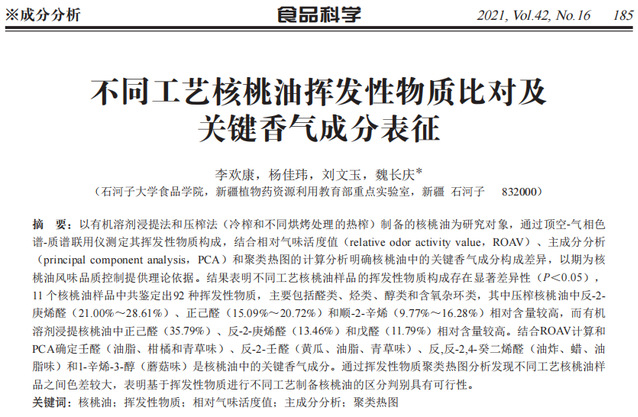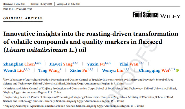 我校食品学院魏长庆教授研究团队,在国家自然科学基金项目(批准号:32360631);新疆农垦科学院科技创新团队(批准号:NCG202301);九师科技计划项目(批准号:2024JS010, 2024JS009)资助下,围绕新疆特色粮油资源为研究对象,开展粮油精准适度加工、功能因子挖掘、风味鉴析与调控、副产物高值化综合利用等系列的科研工作及成果转化。项目探究了热处理对乳清蛋白稳定南瓜籽混合油复合凝析油物理稳定性、界面张力及体外消化的影响(图1),对油莎豆油微胶囊微观结构进行表征和氧化稳定性分析(图2),基于脂质组学探究不同加工方法对沙棘果油脂质成分构成的影响(图3),分析了亚麻籽油中挥发性化合物和质量标记的焙烤驱动转化的创新(图4),还对不同工艺核桃油挥发性物质比对及关键香气成分表征(图5),仅2024年在Food Hydrocolloids (中国科学院一区,Top期刊,影响因子11)、Food Chemistry (中国科学院一区,Top期刊,影响因子8.5)、Journal of food composition and analysis(中国科学院二区,影响因子4)、Journal of Food Science (中国科学院二区,影响因子3.2)、食品科学(EI收录)等食品领域的国际及国内顶级期刊发表论文6篇。
