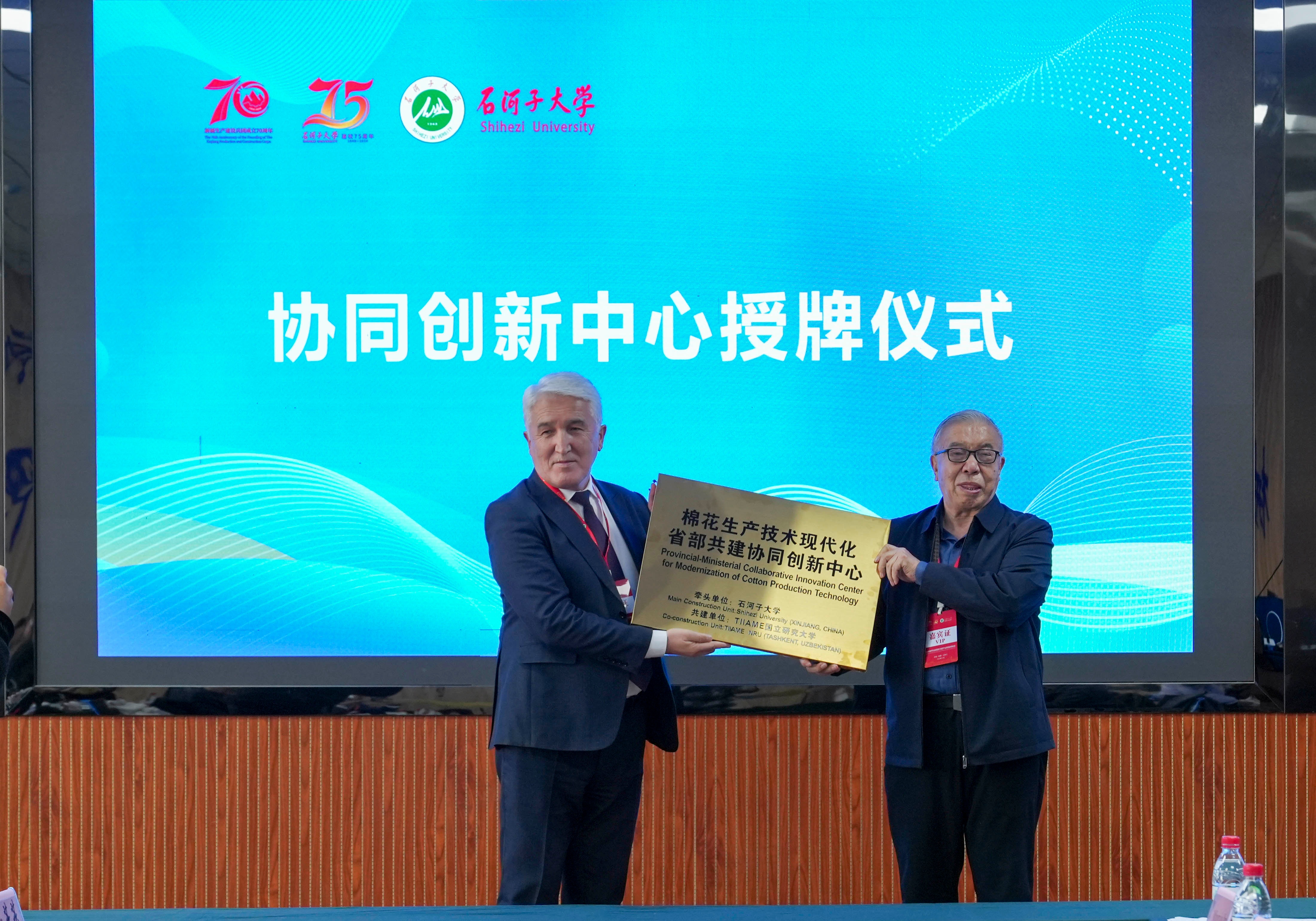 为进一步促进中乌棉花产业高质量发展,石河子大学“棉花生产技术现代化省部共建协同创新中心”将TIIAME国立研究大学纳为共建单位,陈学庚在会上向胡达杨洛夫授牌。