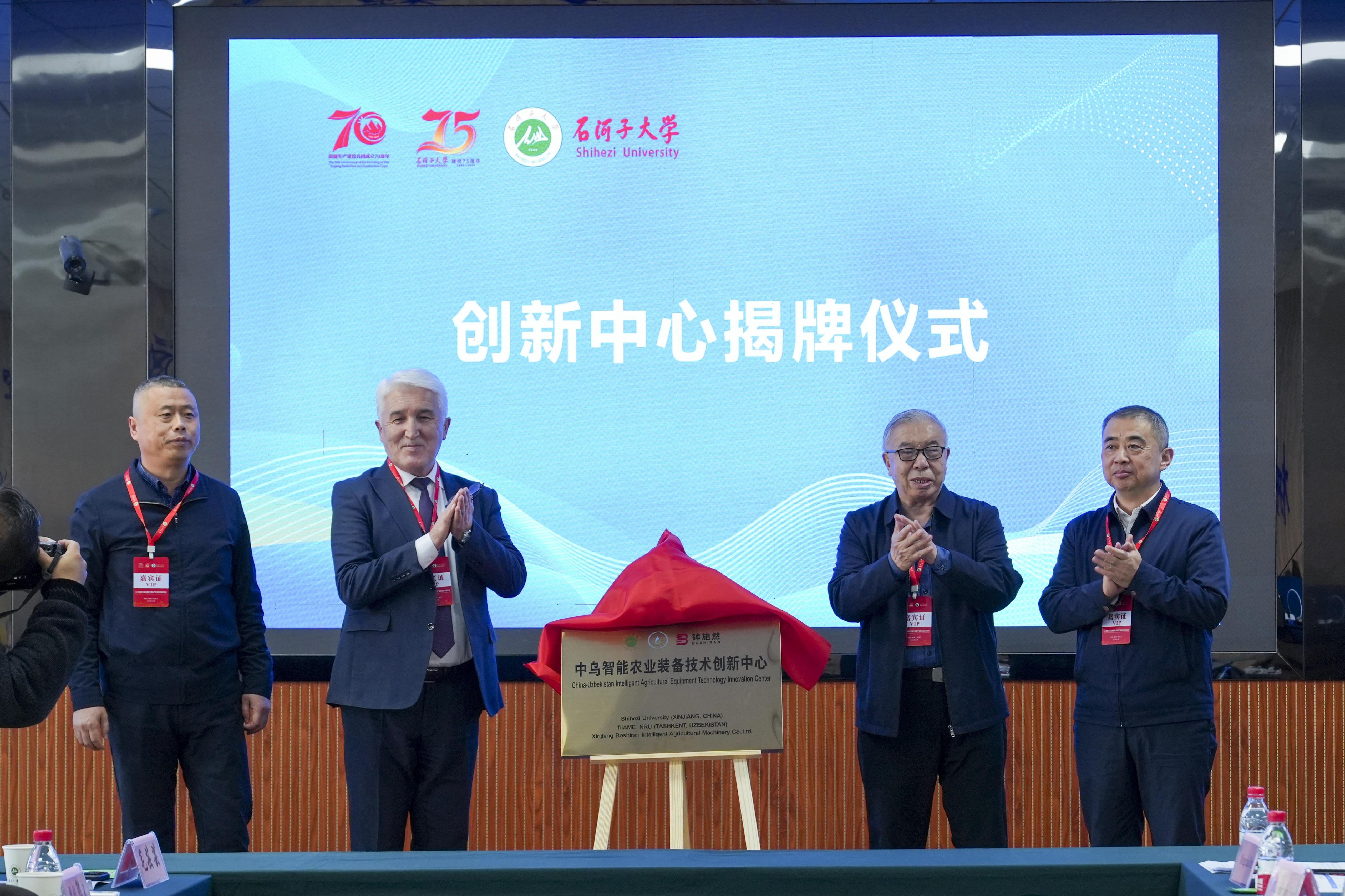 在与会人员的共同见证下,陈学庚、徐善东、胡达杨洛夫和新疆钵施然智能农机股份有限公司副总经理蔡永晖共同为“中乌智能农业装备技术创新中心”揭牌。该中心由石河子大学、TIIAME国立研究大学、新疆钵施然智能农机股份有限公司共同建设,三方将围绕进一步提高中乌农业装备智能化与数字化水平,开展全面、深入的合作。