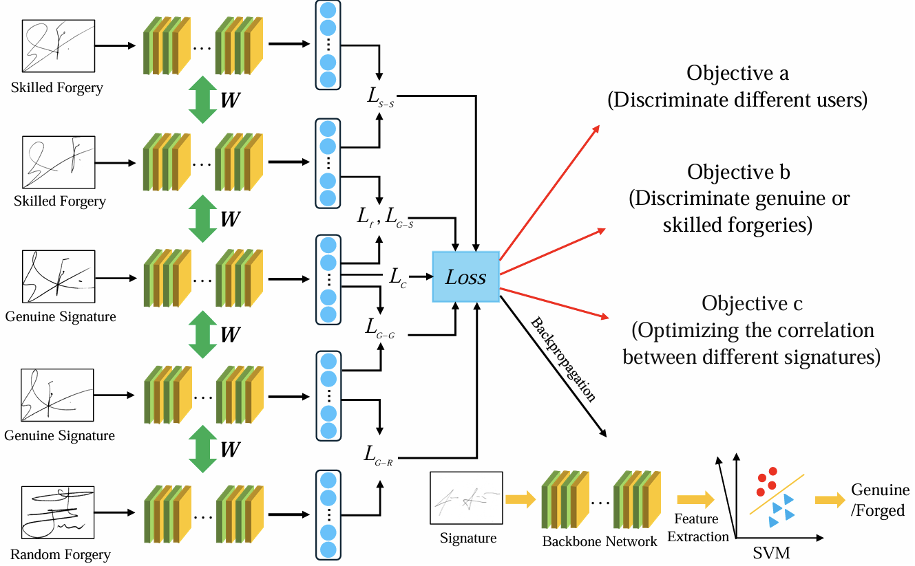 为有效解决“捕捉真实签名和熟练伪造签名之间的微变形特征”这一技术难题,团队首先提出构造4种不同签名组合(真实签名-真实签名、真实签名-熟练伪造签名、真实签名-随机伪造签名、熟练伪造签名-熟练伪造签名),在特征学习阶段使用典型相关分析算法计算和优化签名组合之间的相关系数,使同类签名组合(真实签名-真实签名、熟练伪造签名-熟练伪造签名)之间的相关性更大,不同类签名组合(真实签名-熟练伪造签名、真实签名-随机伪造签名)之间的相关性更小,从而捕获不同签名之间的微小差别,为签名鉴定系统提供更好的特征。