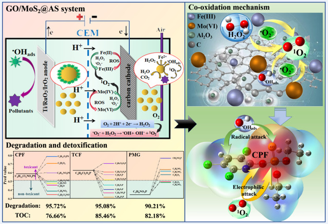 新疆农田耕地面积广,化学农药的使用在有效控制农作物有害生物风险、保障农业增产增效方面发挥了重要作用,但农药的不合理使用引发了一系列问题,农药残留问题已成为社会各界广泛关注的热点话题。此外,自来水厂废弃的铝污泥通常不经处理就被填埋或排放,如此处理不仅造成其内部丰富的金属资源浪费,还会造成环境污染。研究团队基于“以废治废”的观念,不断深入研究废弃物材料在水环境修复中的应用前景,首次提出以金属、石墨、金属协同石墨烯三种改性手段强化废弃物铝污泥,并将其制备成高催化活性的粒子电极,在宽pH条件下实现对水中典型农药的有效去除。同时实现电化学高级氧化体系中由阴极1O2和阳极•OHads介导的可控共氧化机制,该机制结合自由基和亲电攻击途径,能发挥各自优势,具体表现为加速有机农药的降解和矿化过程,同时有效减少有毒中间体的产生。另外,结合量子化学计算了农药化学分子链的断裂位点,证明了共氧化机制对毒死蜱农药的解毒作用。上述研究提出了一种利用废弃物修复有机农药废水的有效、持续的可行方法。