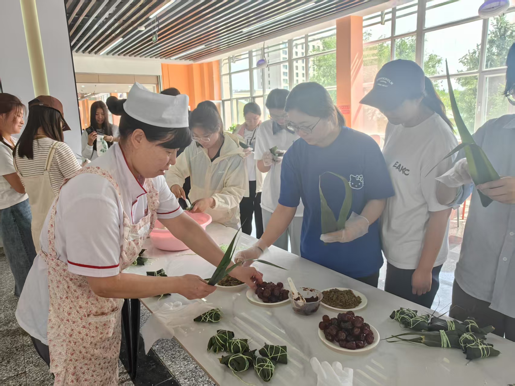 各区食堂还开设专门区域,提供场地,让师生有足够的空间体验包粽子活动。大家围在一起,食堂阿姨亲自示范,手把手教同学们包粽子。同学们捋粽叶、填糯米、绑棉线,动作从生疏到熟练,一个个形态各异的粽子诞生。这份亲手制作的美食,不仅是舌尖上的美味,更成为师生们独特的端午记忆。