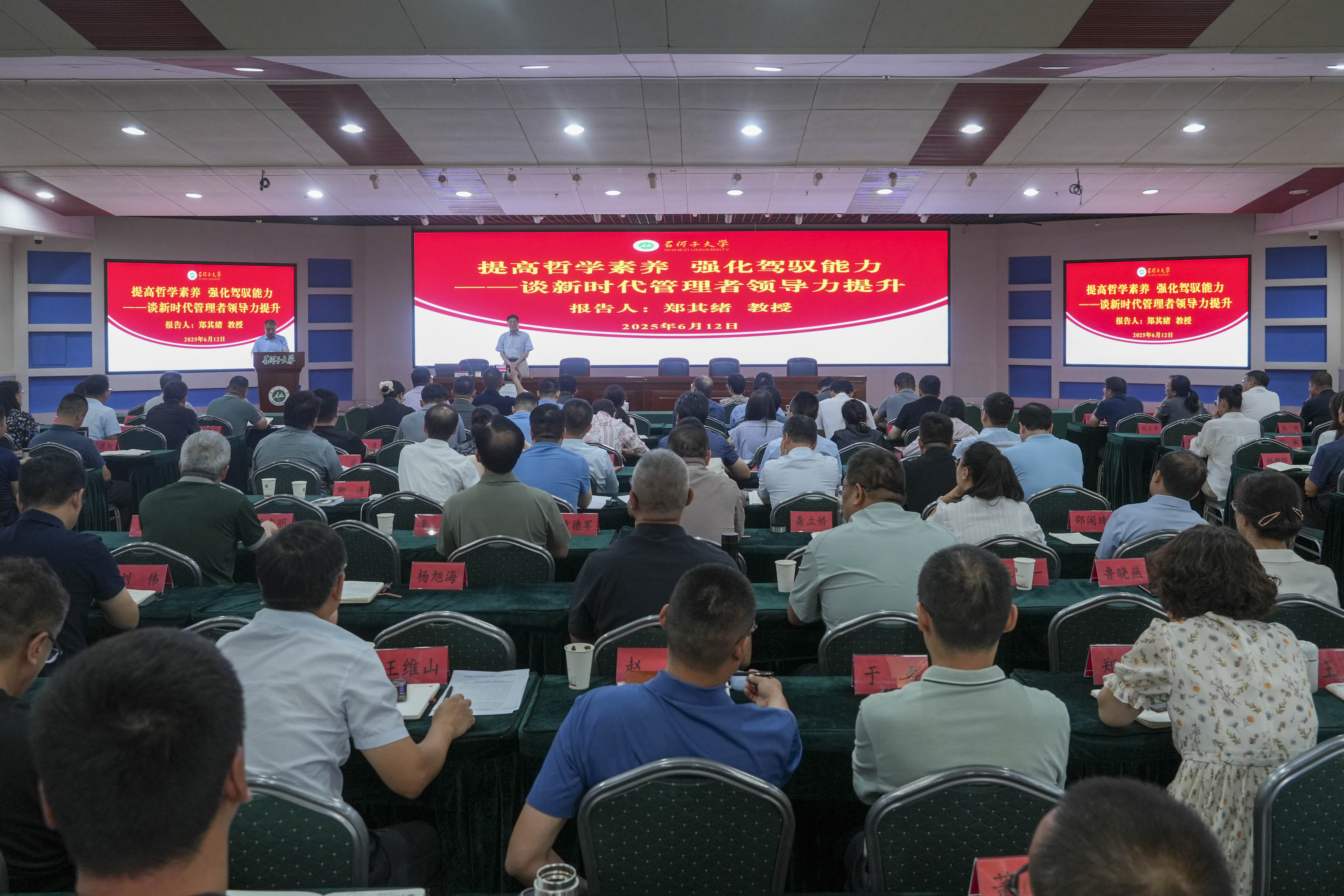 6月12日,我校召开《提高哲学素养 强化驾驭能力——谈新时代管理者领导力提升》专题报告会,特邀中国石油大学(华东)原党委书记、山东省政协常委郑其绪教授作专题讲座。校党委书记徐善东主持报告会,党委副书记、校长李兆敏,党委常委、副校长、组织部部长李鲁华,及学校全体副处级及以上干部参加报告会。