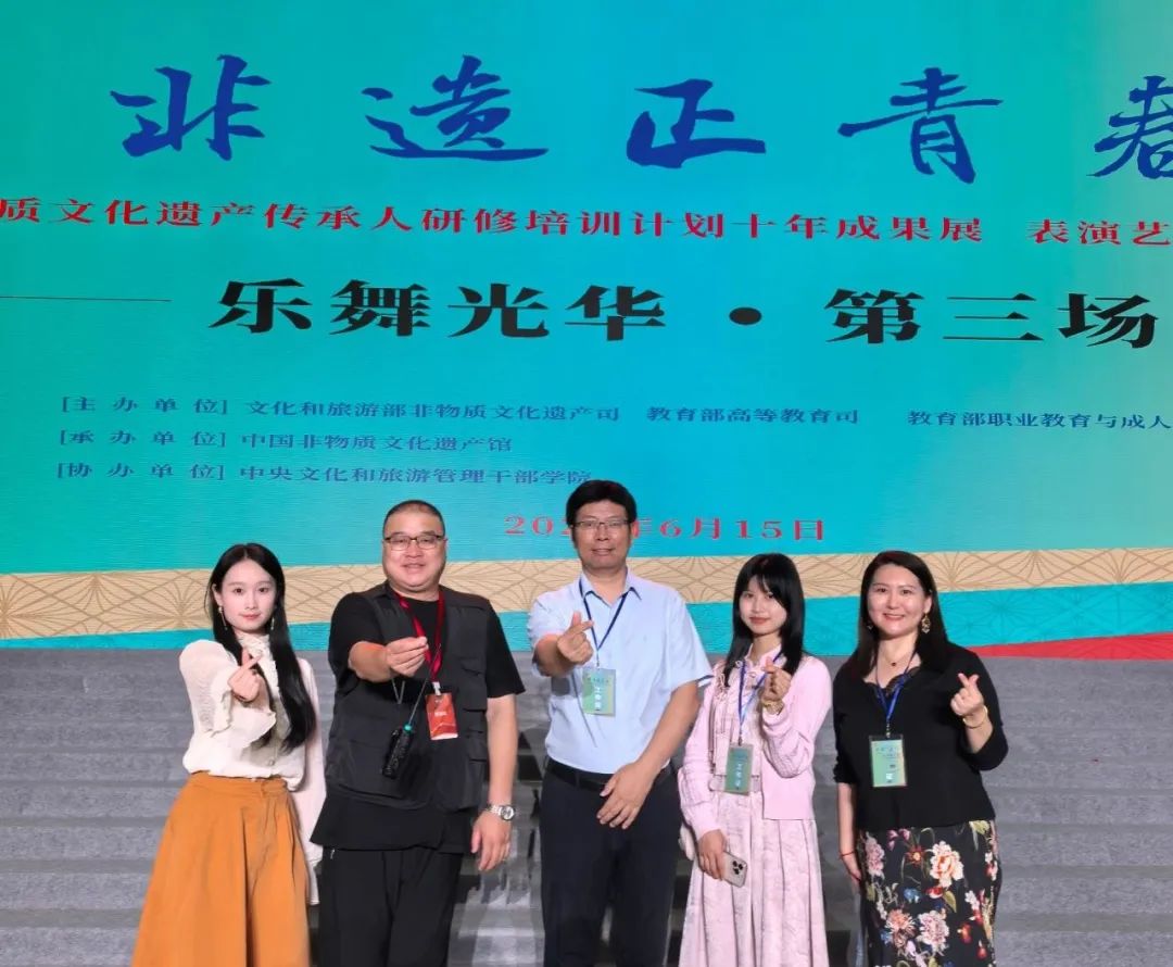 自2025年3月以来,我校文学艺术学院非物质文化遗产团队根据文化和旅游部非物质文化遗产司、教育部高等教育司、中国非物质文化遗产馆等部署,认真积极工作,完成了表演艺术展区主题策划、展览大纲撰写、全国研培院校研培作品和展演节目遴选、《展品清单》审定、展品摆放设计、陈列方案设计,以“乐舞光华”的主题理念,圆满完成990余平米表演艺术展区的精彩呈现。