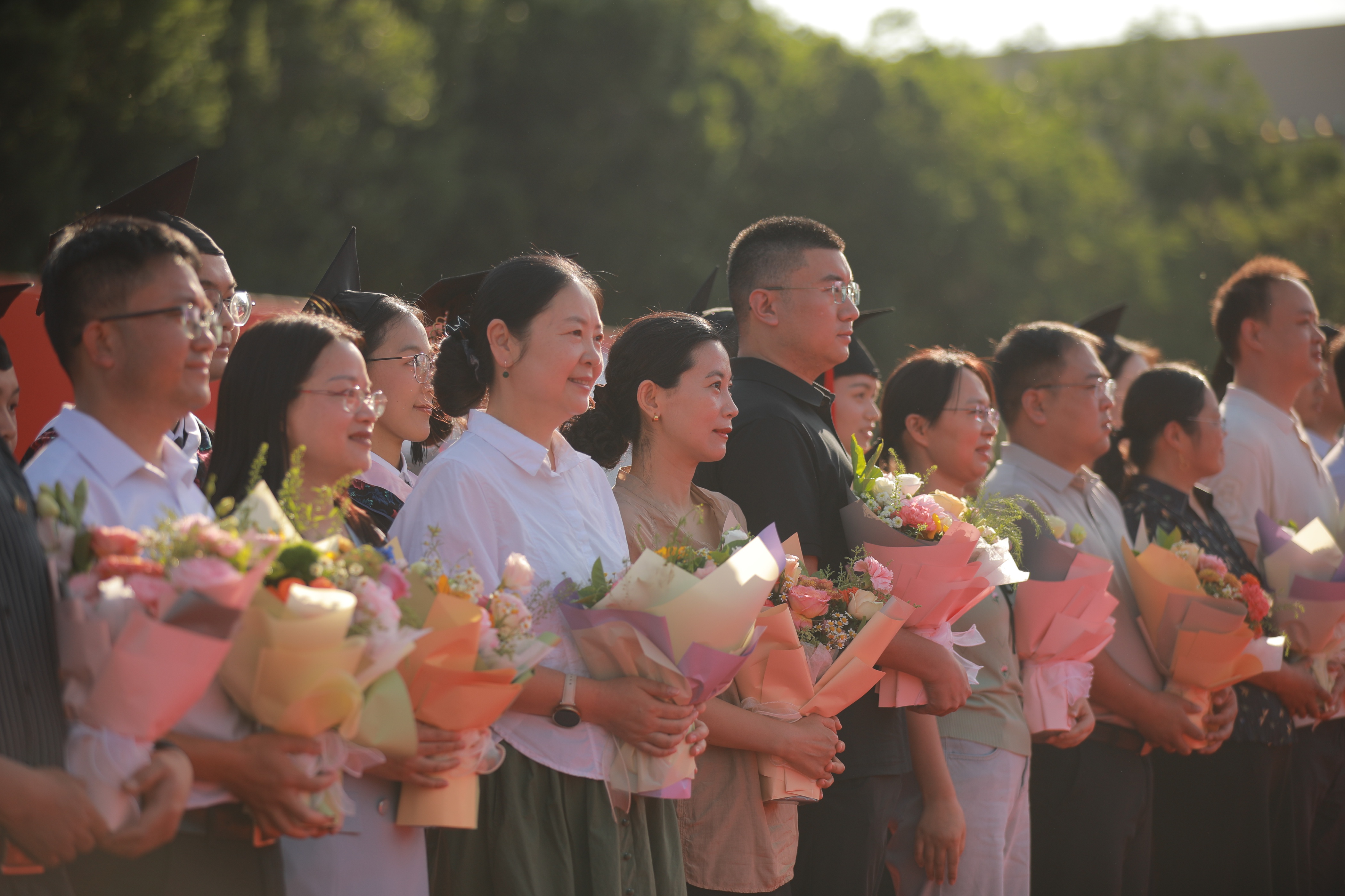 “他们用日复一日的坚守,伴我们走过生活的点滴日常,为我们筑牢求学的坚实后盾……”当画外音响起,宿舍管理员、保洁员、食堂师傅等后勤工作人员,以及银龄教师、援疆教师、班主任等教育工作者依次上台,毕业生代表向他们献上鲜花、深情拥抱。他们平日里的默默付出,此刻为这场青春盛典缀满温情的注脚。