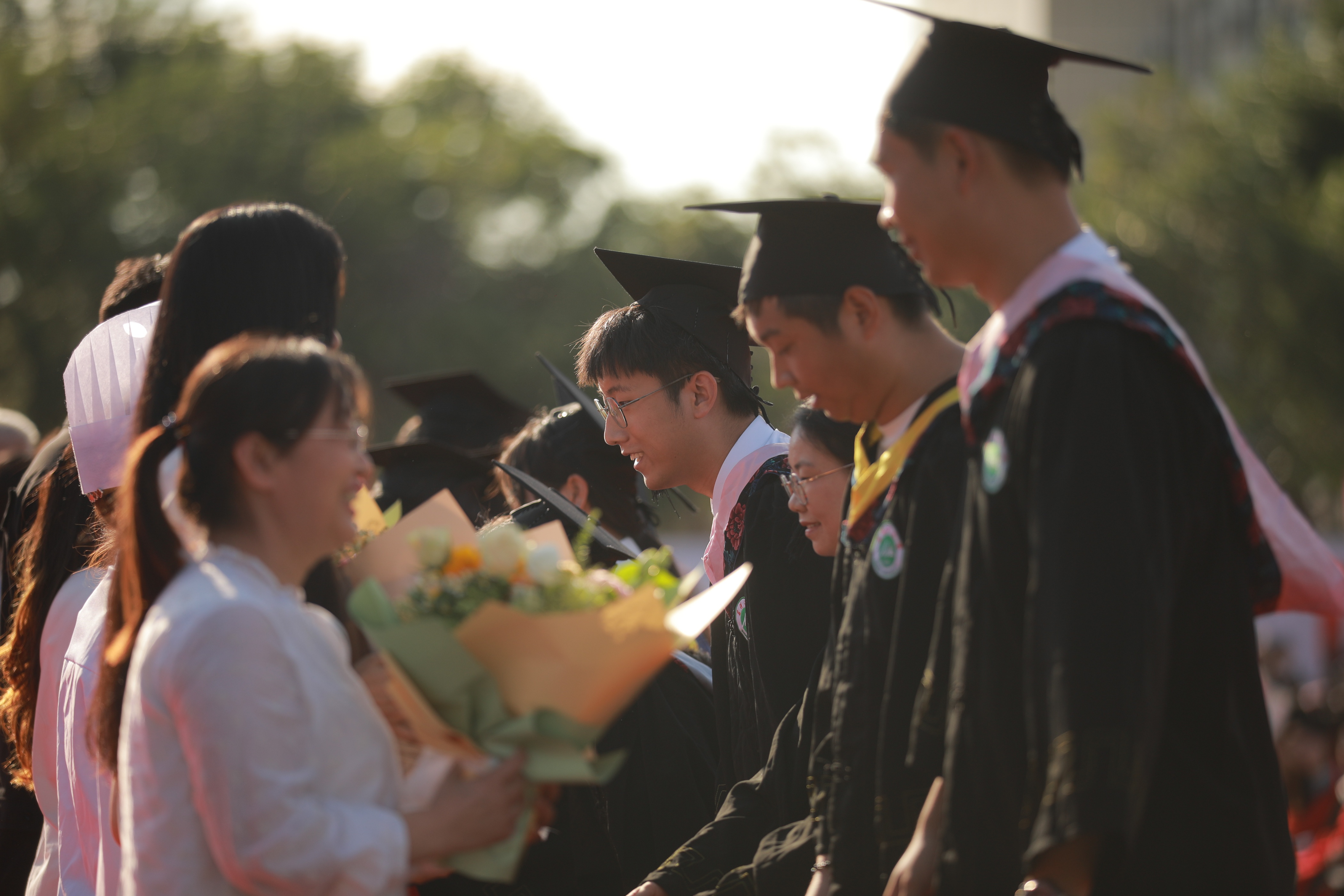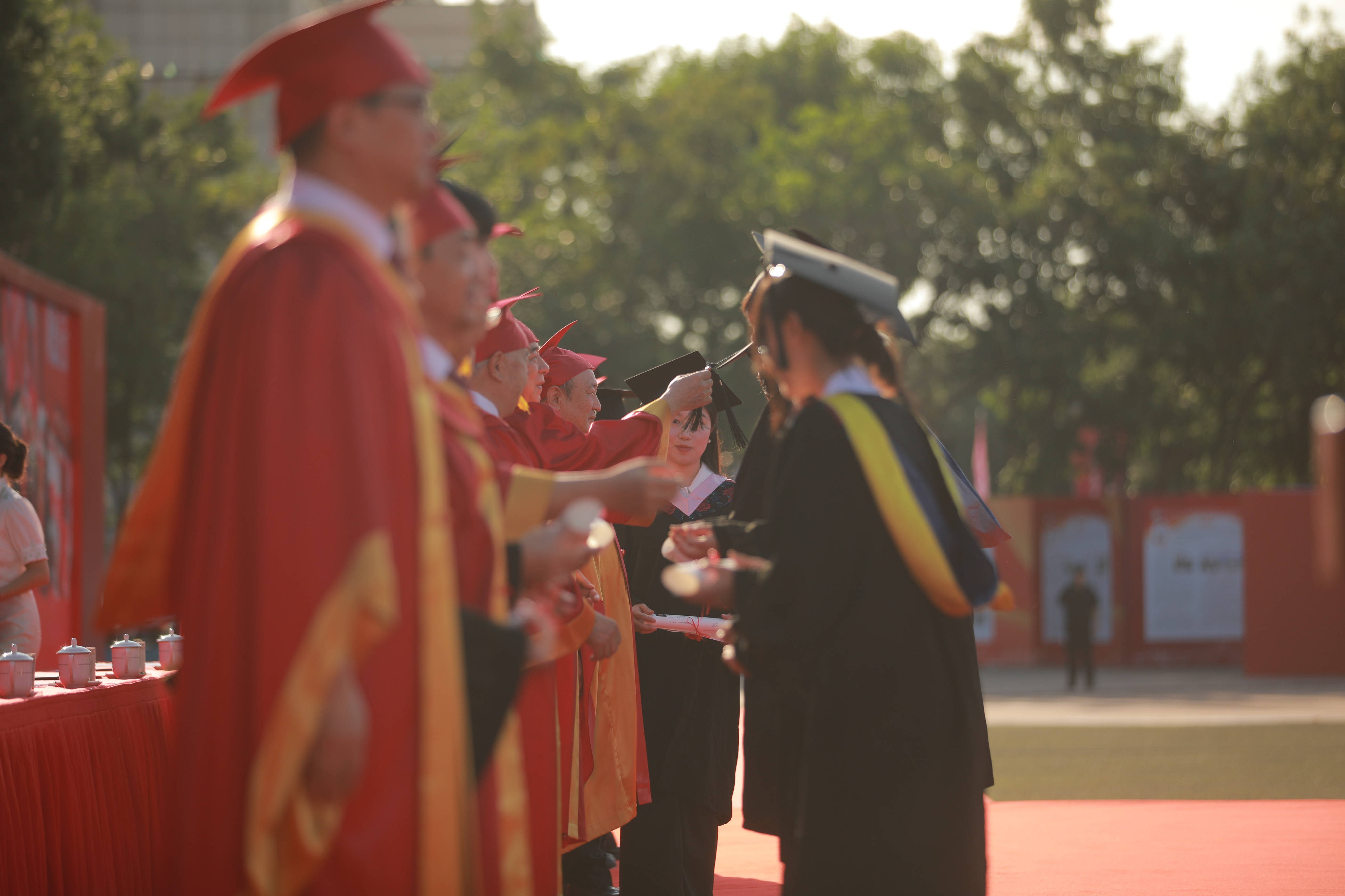 在随后举行的学位授予仪式上,校领导、学院领导及学位委员会委员为毕业生们扶正流苏、颁发学位证书并合影留念。