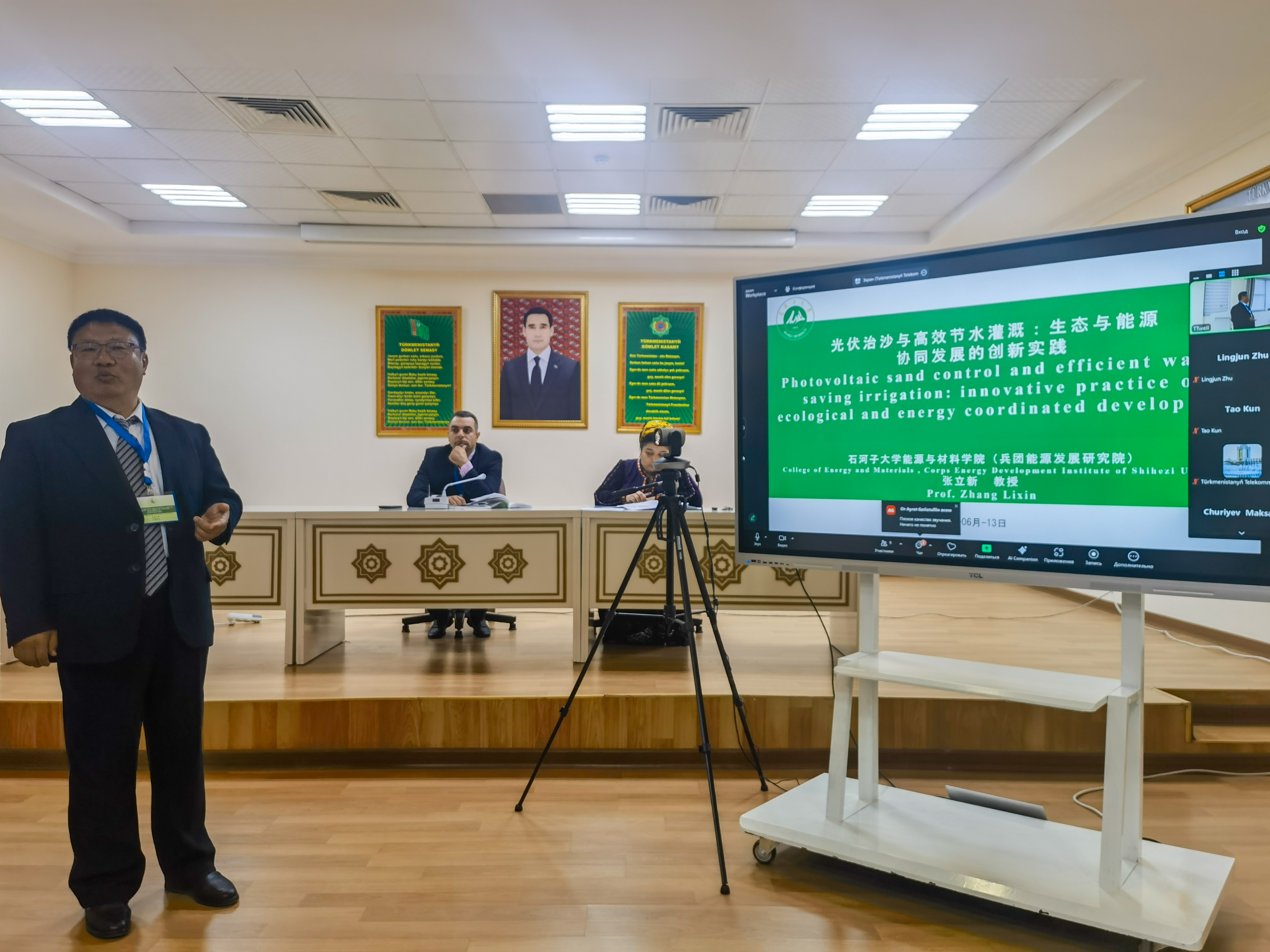 代表团在土库曼斯坦“强国新时代复兴时期的科学、技术与创新技术”国际科学会议上展示了创新性研究成果,张立新作题为《光伏治沙与高效节水灌溉:生态与能源协同发展的创新实践》的主旨报告,系统介绍新疆荒漠化防治与清洁能源融合发展的石大方案,展示干旱区生态—能源协同发展的中国智慧;黎阳聚焦技术前沿,展示界面工程在太阳能光伏器件中的实践应用突破性研究成果。