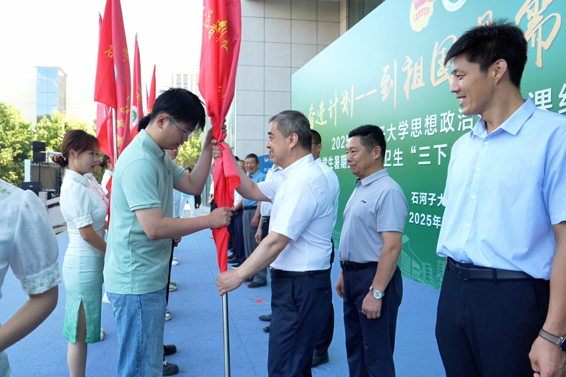 仪式上,徐善东和与会领导分别为国家重点团队、兵团重点团队授旗。参加社会实践活动的指导教师和学生代表们满怀热忱,整装待发。