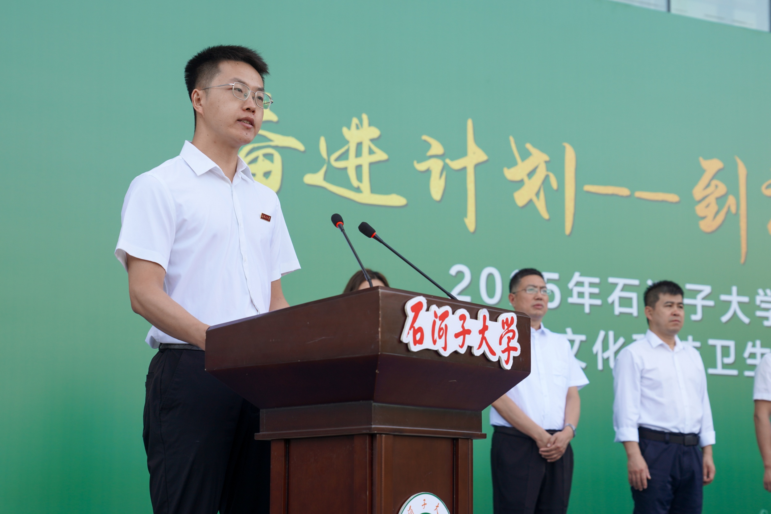 医学院学生张英杰代表全体实践队员发言。他分享了3次“三下乡”的经历和感悟,鼓励初次出征的伙伴勇敢前行,并代表全体队员承诺:带着石大精神与志愿精神,严守纪律、协作共进,书写青春华章。